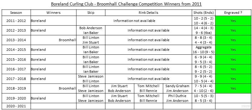 It was made by a joiner with the name of Kelman, hence the Trophy name. It recognises the close association between Broomhall and Boreland Curling Clubs.